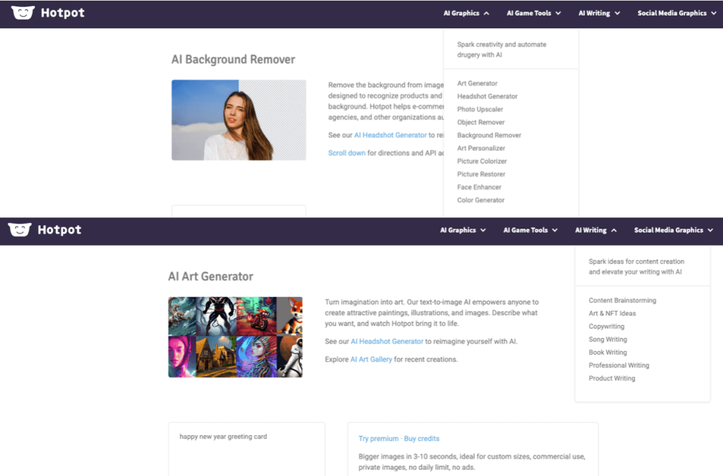 最近看到一個網站 AI TO GROW,列出許多正在應用 AI 的行銷工具包含 ChatGPT,其中有些工具你應該聽過, 如 grammarly、Jasper、Canva。 我隨機挑了 Hotpot,選單上的功能看起來蠻吸引人的。不過我先試了用敘述產生圖的 AI Art Generator 等很久都沒有東西出來,也許她把資源都給 premium 客戶,還要再觀察, 不然就是直接升級 premium 看是否每個功能都能執行。 如果你是 Canva 的用戶,在去年 11 月 Canva 也宣稱有 Text to Image 的功能,也可趕快來嚐鮮用用。