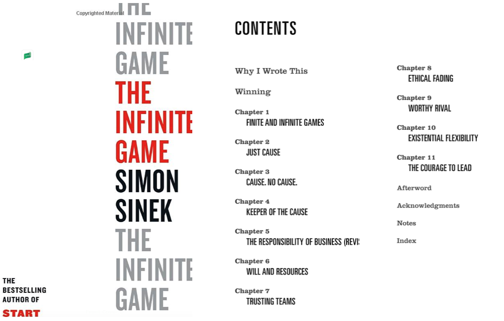 “ 我們如何贏得一場無止境的比賽?有限的遊戲(例如足球或國際象棋)擁有已知的球員、固定的規則和明確的終點,容易確定贏家和輸家。無限遊戲,沒有終點線的遊戲,例如商業、政治或生活本身,都會有來來去去的玩家。無限遊戲的規則是變化的,且無限遊戲沒有定義任何終點。沒有贏家或輸家,只有領先和落後。