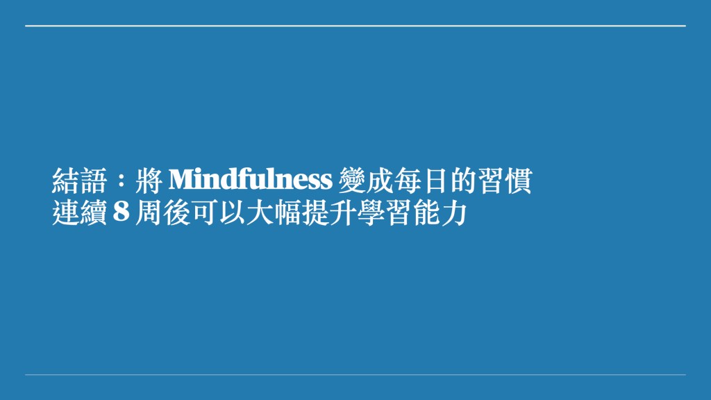 根據哈佛大學研究,練習 Mindfulness 8 週後對於學習能力有顯著地增加如果你對你的學習一直卡關,不妨學習一下 Mindfulness ,對睡眠品質也會有幫助