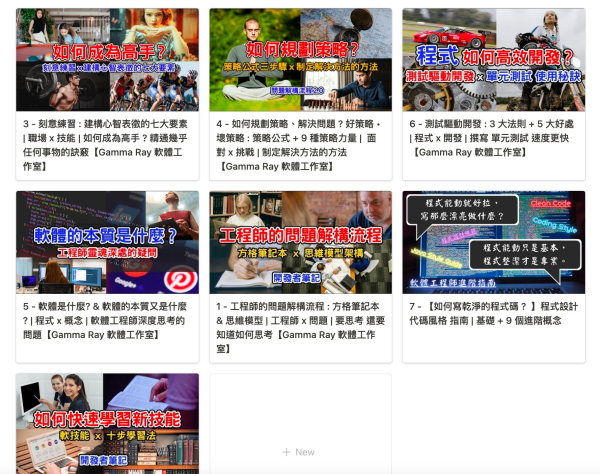在介紹這個播放清單之前先工商廣告一下,你看到這篇文章分享的代表圖,是用 Learning Notes Plus 建立的 Youtube 播放清單 Notion 筆記資料庫的 Gallery View 所擷取出來的,為了方便以後的複習,我也把影片的名稱翻譯成中文