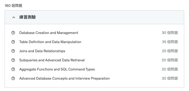 本課程分為六個綜合部分,每個部分專注於 SQL 和資料庫管理的不同核心方面。