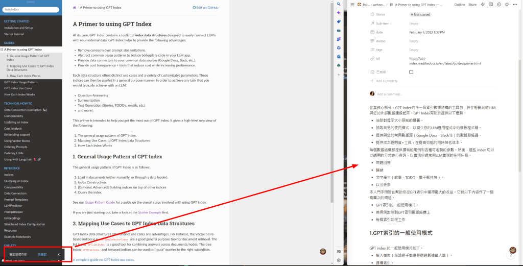 對了 LN+ for Web 不是只有跟 ChatGPT 整合,它可以用在很多地方,除了 ChatGPT 我最近用最多的就是最近在看很多 OpenAI 技術文件網站或是開源程式庫文件時的筆記關聯,我下次再進入這些 GPT 技術網站時,LN+ for Web 就會跳出提醒我上次寫的筆記連結,如下圖所示,這是我前一陣子在看的線上技術文件,有了 LN+ for Web 幫我省下不少找筆記的時間