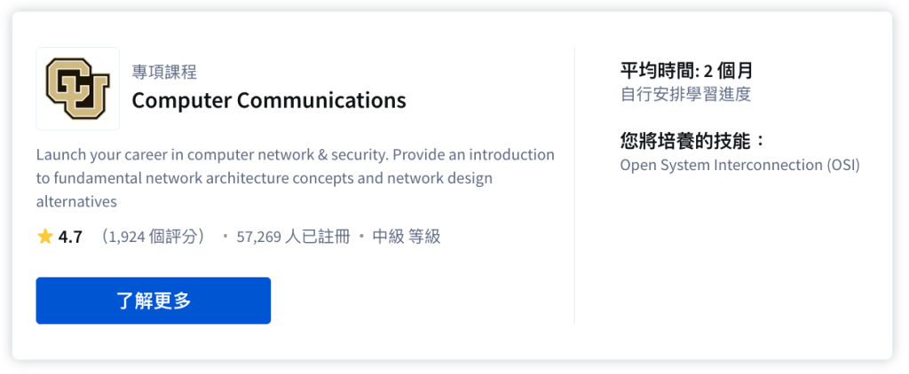 如果您是該領域的新手,請考慮參加自定進度的介紹性線上課程,例如 IBM 的雲端運算簡介。這裡將介紹您世界領先的雲端服務供應商,並獲得從業務角度理解雲端運算所需的基礎知識。對於中級學習者,可以考慮參加科羅拉多大學的電腦通訊專業來挑戰自己,您可以在其中學習應用網路理論和設計原則。