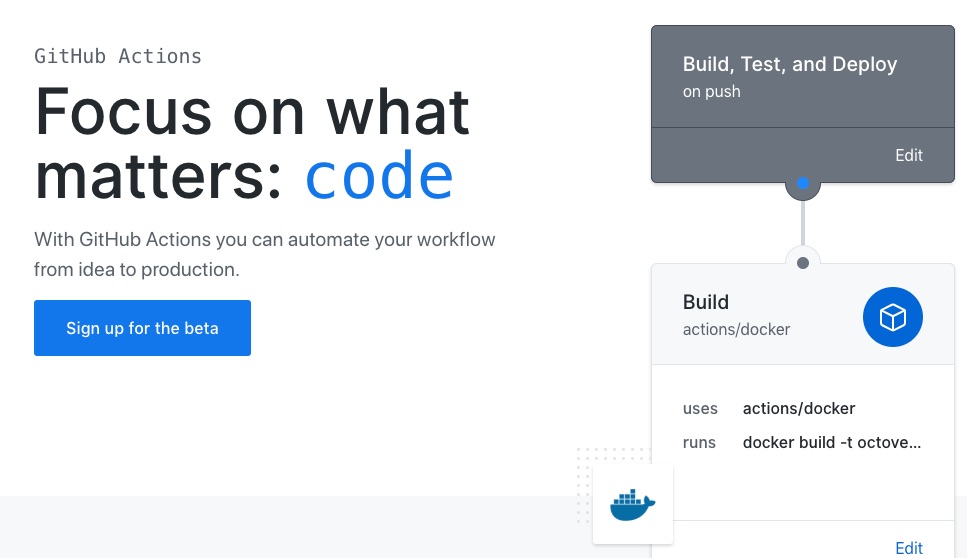 GitHub 的 Actions 功能,這對於有在實行自動化部屬流程的團隊是一個很棒的功能,例如你可以透過 Actions 來將 source code 封裝成 Docker image ,然後部屬到雲端