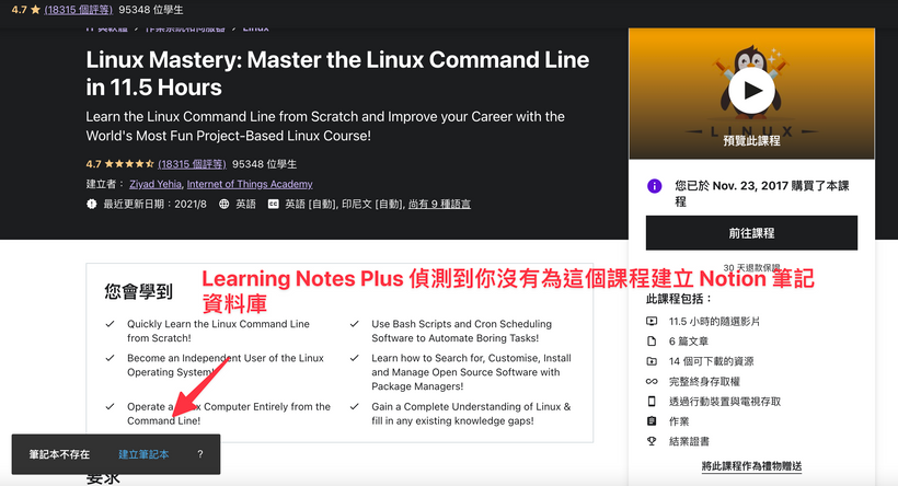 從以上的簡單操作說明,你應該會發現,你只要專心上課,想紀錄的時候就打開筆記連結,並不需要去思考課程的筆記放在哪裡?未來也不會忘記筆記放在哪裡,你只要記得課程在哪裡就好,要複習的時候,只要到課程的影片網址,Learning Notes Plus 就會自動把你的 Notion 課程筆記連結自動顯示出來,所以要複習課程內容也很方便