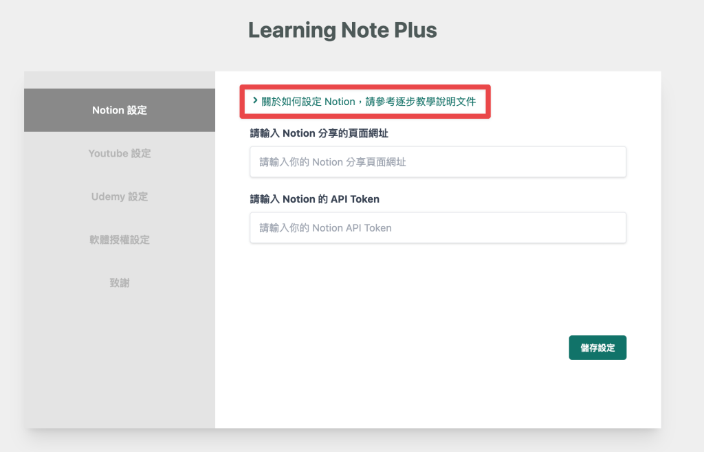 安裝後,你的瀏覽器會出現這個畫面,點選畫面中標示的連結開始設定 Notion : 設定好 Notion 與 Learning Notes Plus 的連結 ,這份文件會教你如何設定 Notion 與 Learning Notes Plus 的整合,但是首先你要先有一個 Notion 的帳號 ,使用 Notion 免費版就可以了