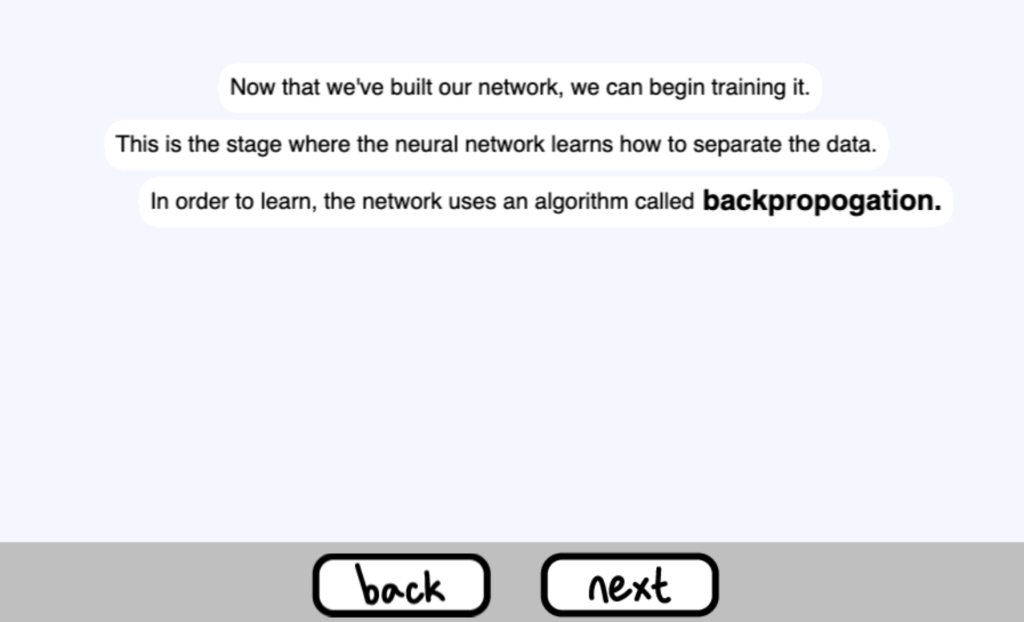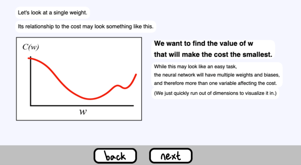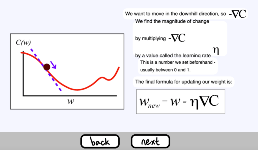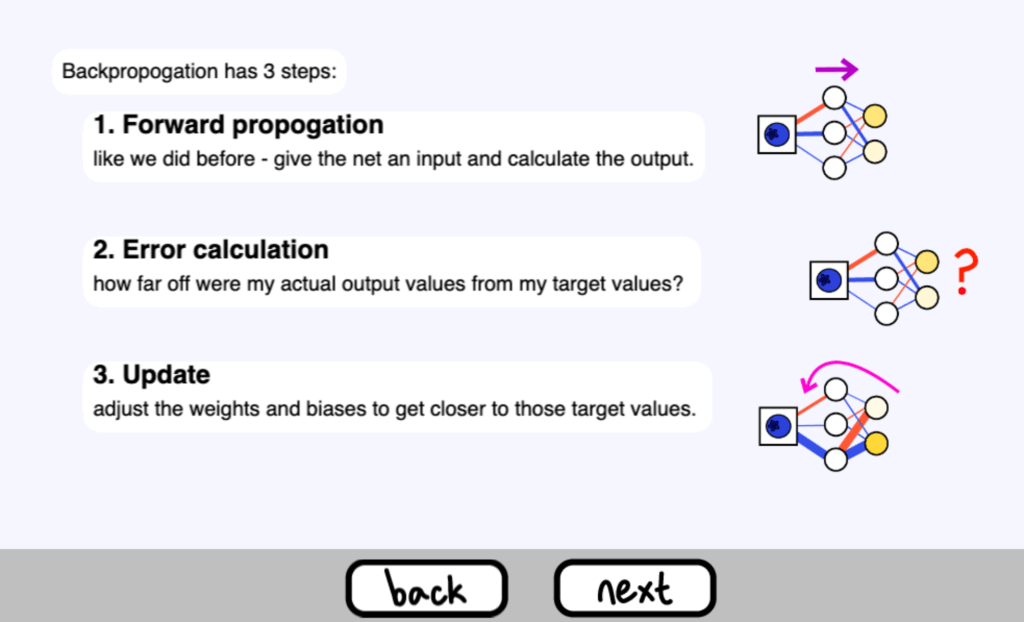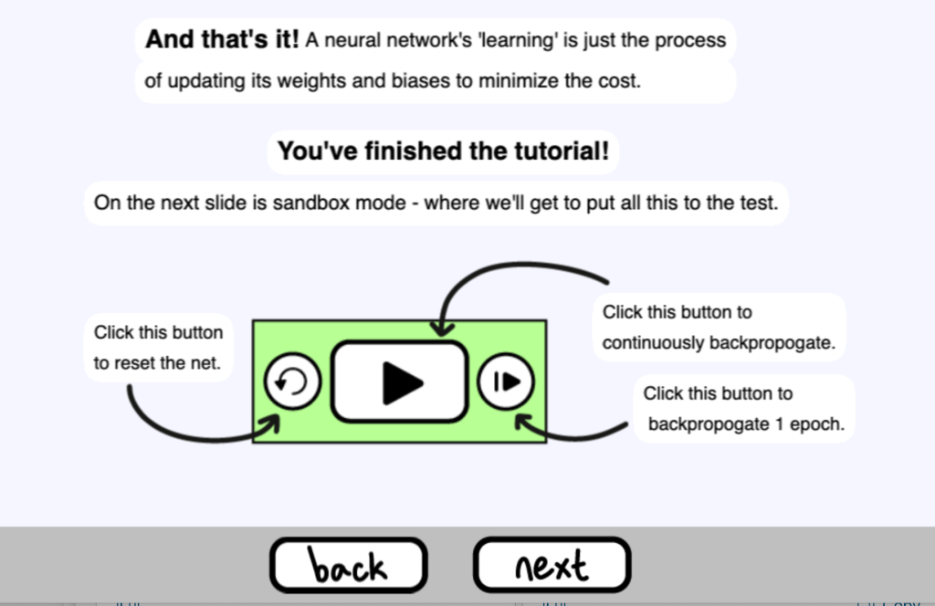 就是這樣!神經網路的 “學習 “只是更新其權重和偏差以使成本最小化的過程。接下來你可以到 Sandbox 模式觀看整個訓練的過程,可以自動執行不斷地反向傳播,或是每次只執行一次 epoch