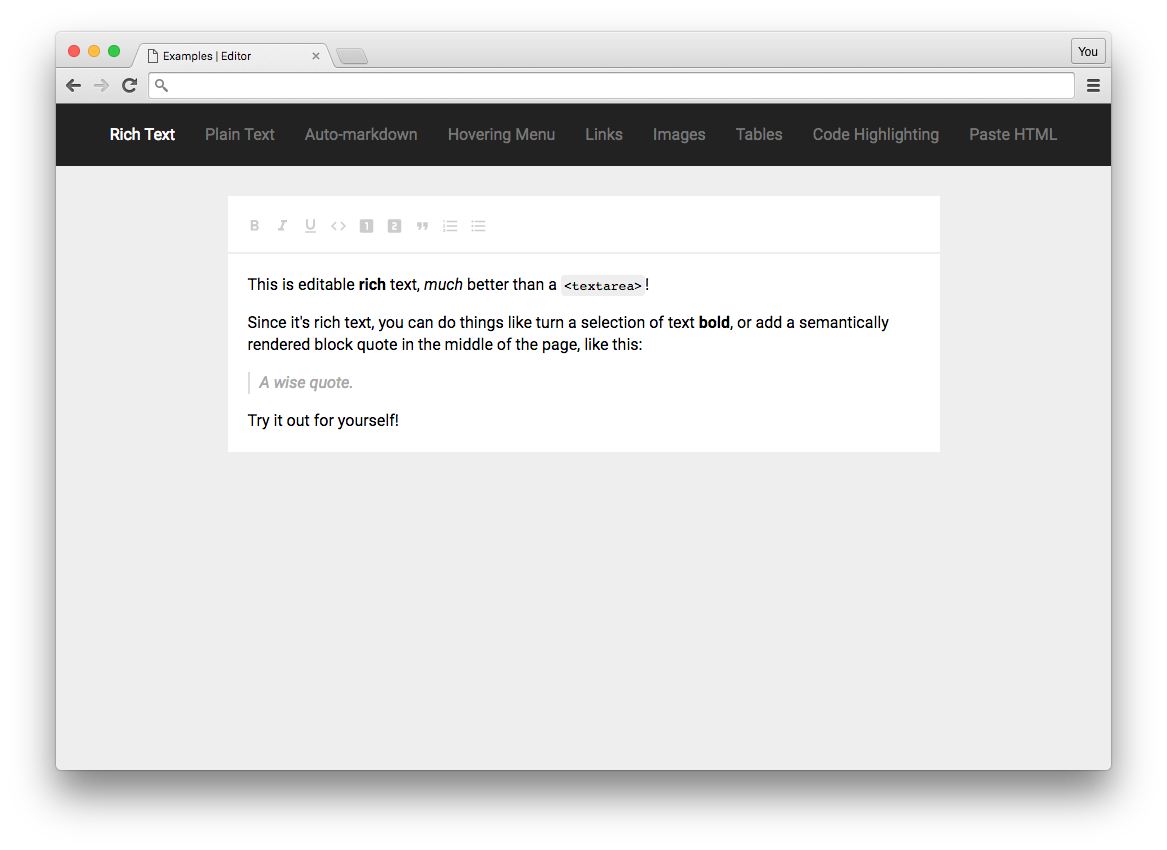 它之所以能做到這一點,是因為它的所有邏輯都是通過一系列外掛實現的,所以你永遠不會受到“核心”中是或不是什麼的限制。 你可以把它看作是在 React 之上構建的一個可插入的 contenteditable 的實現。 它的靈感來自 Draft.js、 Prosemiror 和 Quill 這樣的程式庫。