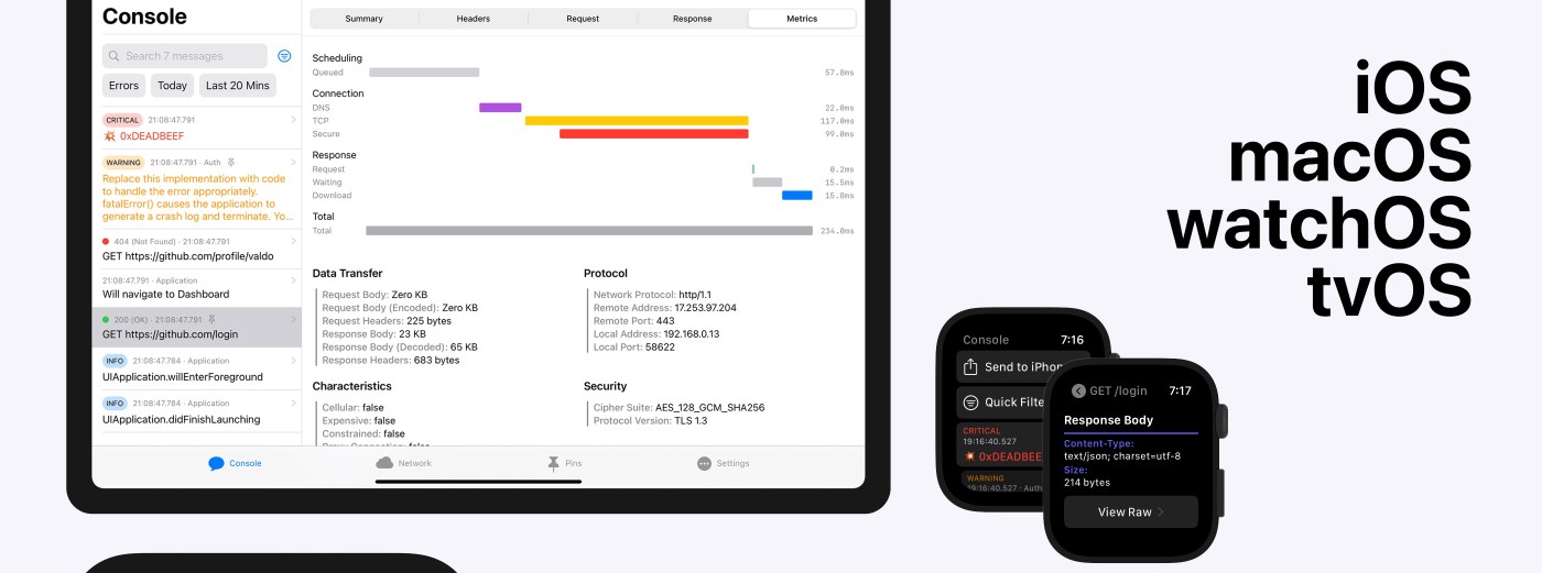 使用 Pulse Console 從你的 iOS 應用程式中直接記錄和檢查網路請求和紀錄。在 Pulse macOS 應用程式中分享和檢視日誌。日誌在本地記錄,不會離開你的裝置。瞭解更多資訊請訪問 kean.blog/pulse 🔗。
