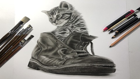 學習如何用木炭鉛筆畫出逼真的鞋中小貓。鉛筆畫是一種很酷的藝術