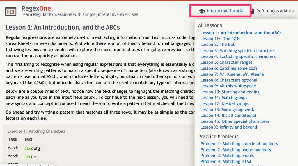無論是在做前端、後端或是資料分析,正規表示式是一種很快速的方法幫助你比對、篩選字串。這個網站提供了互動式的練習幫助你熟練正規表示式