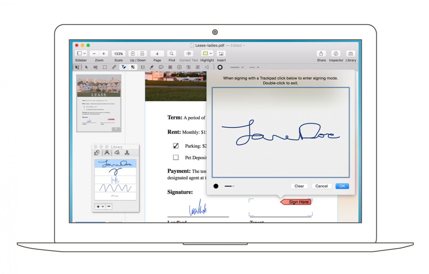 做完這, 我想到最近有要簽的合約,對方剛寄來 PDF 檔,要我簽完 email 給他即可。 以前都是先印到書面後用筆簽名,然後掃描回 PDF 再傳 email. 這個 PDFpen 可以在 PDF 上填字與簽名,就來試試看吧 !