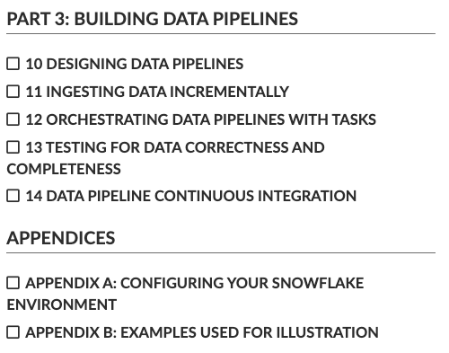透過本實用指南,您將掌握在 Snowflake 平台上建立有效資料管道所需的技能。 您將了解 Snowflake 如何輕鬆處理非結構化資料、使用 Snowpipe 設定持續攝取,並透過一流的資料治理功能確保資料安全。 在此過程中,您將透過相關的實作範例來練習最重要的資料工程任務。