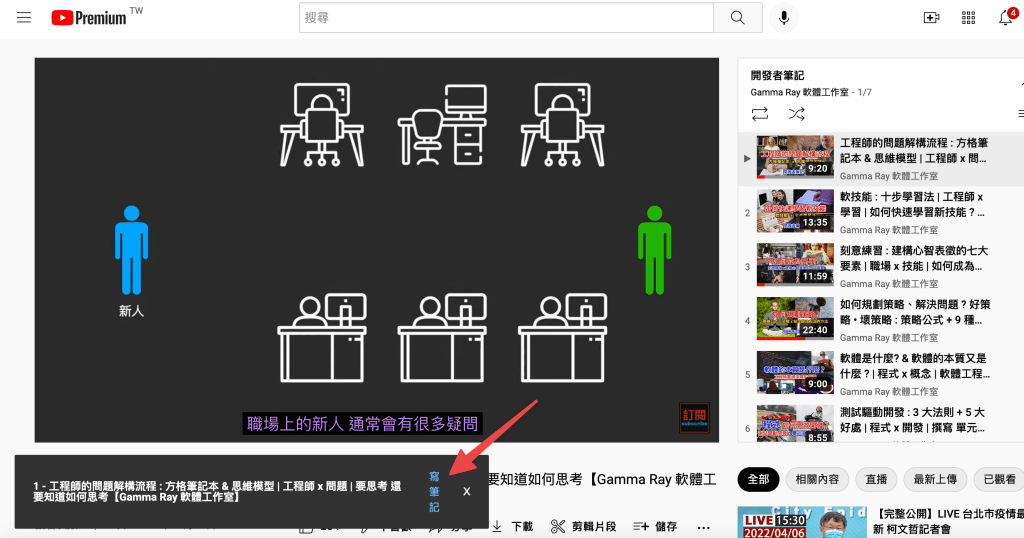 如果你的電腦有安裝 Learning Notes Plus 並為這個播放清單製作 Notion 筆記資料庫,你在觀看時會自動出現筆記的連結,如下圖所示